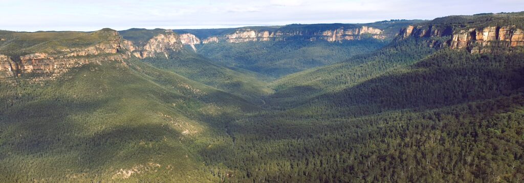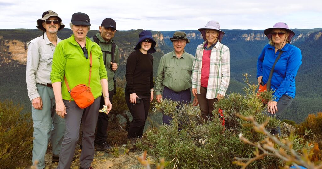 Climbing about 250m up the trail on the north side of Mt. Banks from the carpark was our first challenge. At least 2 stops to remove clothing were needed. Stopping at our 1st lookout offered excellent views to our west. Once at the Mt. Banks summit, more fantastic views offered us a clear view south to the Gross River, Blue Gum Forest, Perrys Lookdown, Junction Rock and Govetts Leap Falls, and to our west, the valley leading to Mt. Victoria. Descending the south east track back to the fire trail was an easier. Now continuing south for 2.2km along the fire trail, we reached a great lookout along Banks Wall for morning tea. Another 250m brought us to our first off-track route to Frank Hurley Head. This ridge was easy to navigate via mostly low plants including some lovely small Banksia species about 1 foot high. Wattles were in full bloom in many areas. The lookout at to Frank Hurley Head offered views extending further to our south and south east, downstream along the Gross River. We speculated which outcrop was Lockley Pylon as its appearance was different from the north. Looking now at the map, it was likely obscured by Du Faur Head. Returning via a shorter off-track route, we returned to the fire trail to continue another 180m before our next off-track route to our 2nd unnamed headland and lookout. From hear we could peer down into a deep ravine to our east with spectacular vertical cliffs on the other side. After a group photo taken, we now returned via the fire trail that leads to this headland, back to the main fire trail. We quickly realised that this was the end of clear fire trail as we now pushed through overgrown shrubbery along this Explorers Range track to our east. Our aim was to reach Edgeworth David Head for lunch. Finding a suitable exit, we navigated our third off-track route uphill through quite dense bush. It opened up for a while until we reached the first summit but it then got denser for what would have been the last 200m. We aborted this attempt, turning to our west to find an alternate lunch spot. An open grassy patch with views to our west was fine for lunch. Returning downhill to the overgrown fire trail, we quickly returned to the car park over this 6.5km section of this 14.7km walk.